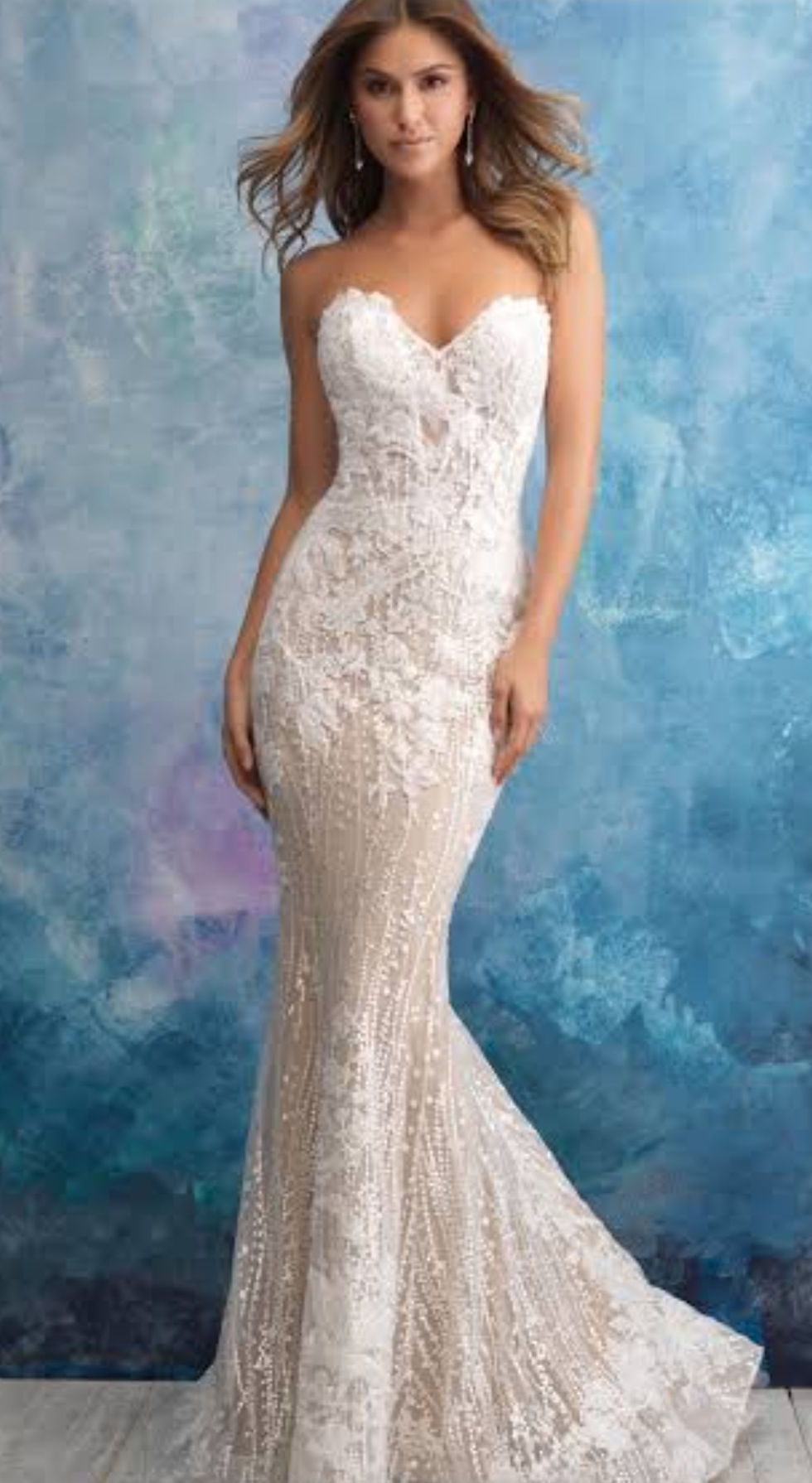 Lovely lace motifs cascade over the bodice and skirt of this tulle A-line wedding dress, accenting the illusion plunging V-neckline, illusion straps, and illusion plunging back. Finished with crystal buttons and zipper closure. Beaded belt accented in Swarovski crystals sold separately.